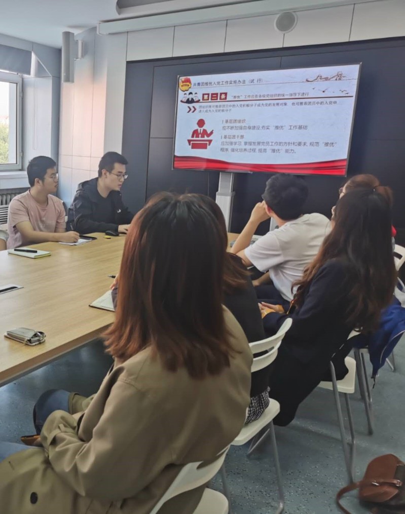 夏玮同志领学了《共青团推优入党工作实施办法》。共青团推优制度是团的助手和后备军作用发挥的重大制度安排, 是党团血脉联系的组织依托。夏玮同志从共青团推优入党工作实施办法的总则、推荐对象和推荐条件、“推优”工作程序等方面进行解读,最后结合计算学部实际,制定了下一阶段学部团委推优入党的工作计划。