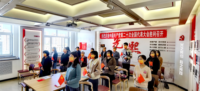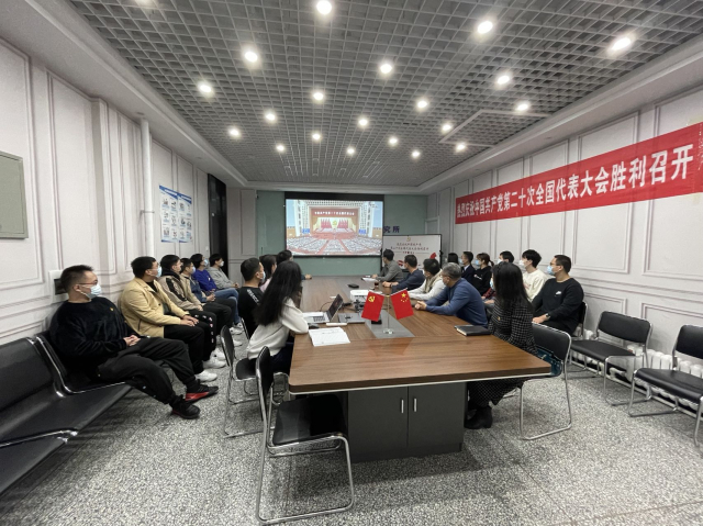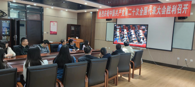 现场热烈庆祝中国共产党第二十次全国代表大会胜利召开的横幅和鲜红的党旗悬挂于会议室中,观看现场的气氛庄重而热烈。