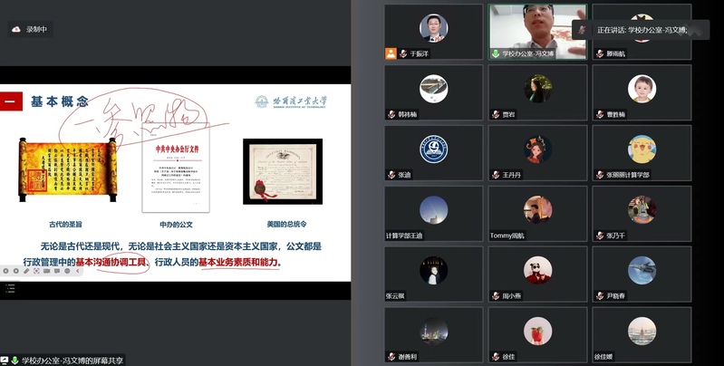 为进一步提升学部办公室行政管理人员公文写作能力,规范学部公文管理,学部办公室于1月30日下午通过线上方式举办了《哈尔滨工业大学公文操作规程手册》学习讲座,本次讲座邀请的嘉宾是学校办公室的冯文博老师,学部办公室全体行政管理人员参加了本次讲座,讲座由办公室副主任于振洋主持。