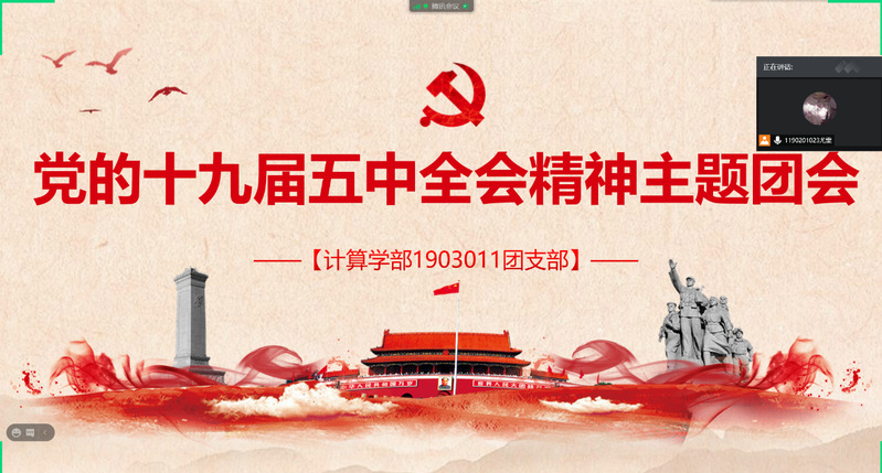 为了响应共青团中央的《关于认真学习宣传贯彻党的十九届五中全会精神的通知》,运用好《教育系统党的十九届五中全会精神宣讲报告会》宣讲材料,计算学部1903011团支部于2020年11月27日召开了线上“学习党的十九届五中全会精神”主题团日活动,团支书尤雯主持团日活动。