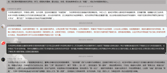 本次活动中,团支部以宿舍为单位组织全体同学观看两会直播回放,共同学习两会精神,接着以线上交流的方式分享收获与感悟。同学们纷纷表示全国两会精神内涵丰富,为中国之巨轮在世界发展的大海中继续行稳致远指引了方向。同学们各自从经济、文化、政治、国际等多角度分析探讨两会精神,表达出“功成不必在我,建功必须有我”的报国情怀,互通有无,受益良多。本次活动取得预期效果。