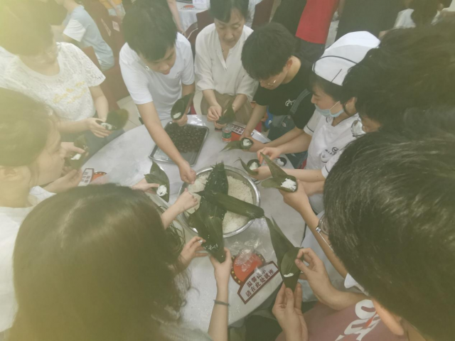 一声声欢歌笑语,一张张同学们包粽子时专注的脸庞诉说着对于中国传统文化的热爱。击鼓传花、成语接龙、端午节知识抢答……老师和同学们仿佛早已忘记夏天的燥热,尽情的嗅着空气中粽叶的清香,融入庆祝节日的喜庆氛围中。粒粒晶莹的糯米、片片碧绿的粽叶、韧性十足的粽绳,包裹着的也是对于生活的热爱以及对于亲人们的一片片温情。轻轻放入一颗红枣,放入的是心中对于甜蜜生活的向往。