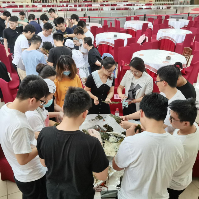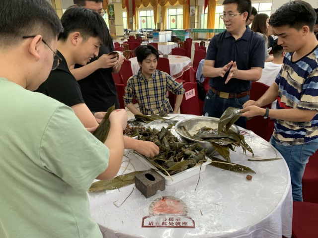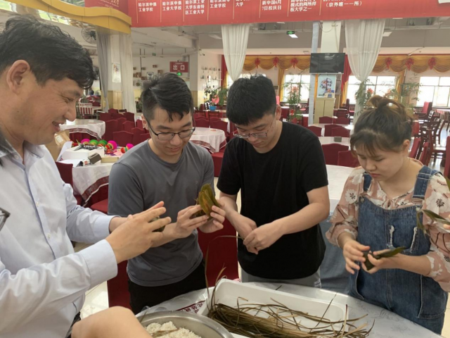 活动伊始,老师和同学们在食堂阿姨的详细讲解后,热火朝天地包起粽子来。大家围坐一团,其乐融融。在包粽子的同时,老师们也细细询问同学们近期的学习情况、生活状态以及未来规划等问题,耐心解答学生心中的疑惑。其中,孙文博书记讲到:“包粽子,看似只有简单的几步,但也需要我们不断的琢磨与实践才能把粽子包的有模有样”。与此同时,在活动中,本部和深圳校区交流交换的同学亲切交流,畅谈深圳校区和本部的区别,也表示在本部的学生、生活、交友等方面都收获颇丰。