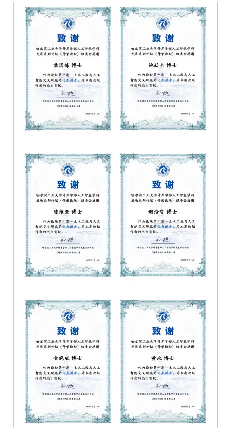 最后,姚鸿勋教授和鲍跃全教授共同主持Panel讨论环节并组织在线合影。计算学部为6位演讲者颁发了荣誉证书。本次论坛是计算学部和土木工程学院合作的新跨越,实现了精准的需求与技术分享,将进一步推动哈工大人工智能学科和土木工程学科的深度融合。整个报告峰值在线人超过350人,获得了广泛关注和认可。