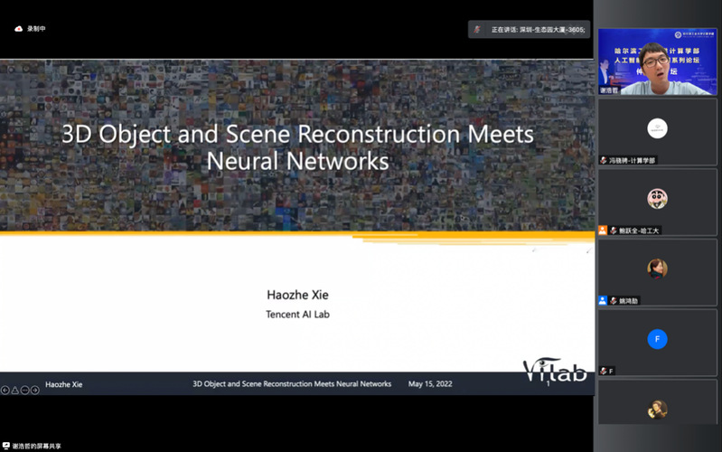 谢浩哲高级研究员作了题为《基于神经网络的三维物体重建》的报告。本次报告详细介绍了一系列从大量样本中学习形状先验的三维物体重建方法,这些方法甚至可以从单视角的图像推测某个物体完整的三维结构。随着输入视图数量的增多,重建结果可以被不断改善。