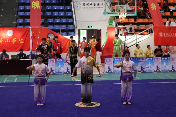 在男子甲A组器械对练比赛中,计算学部2021级本科生李卓凌、计算学部2020级本科生胡光辉、基础学部裴元清组成的男子双刀进双枪三人对练以8.45分的高分夺冠,为哈工大代表队赢得了首枚金牌,也是本次比赛中获得的唯一一枚金牌。