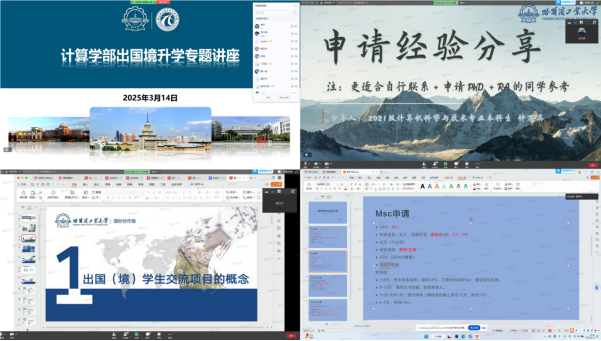 为帮助计算学部学生更好地了解出国境升学方法和路径,3月14日晚,计算学部团委于线上举办出国境升学专题讲座。本次讲座邀请到计算学部国际合作秘书张乃千,2021级本科生钟万淇、殷梓然为同学们做出国留学指导和经验分享交流。讲座由学部团委负责人薛文主持,辅导员张云祺和有意向赴海外交流学习的同学们参与此次讲座。