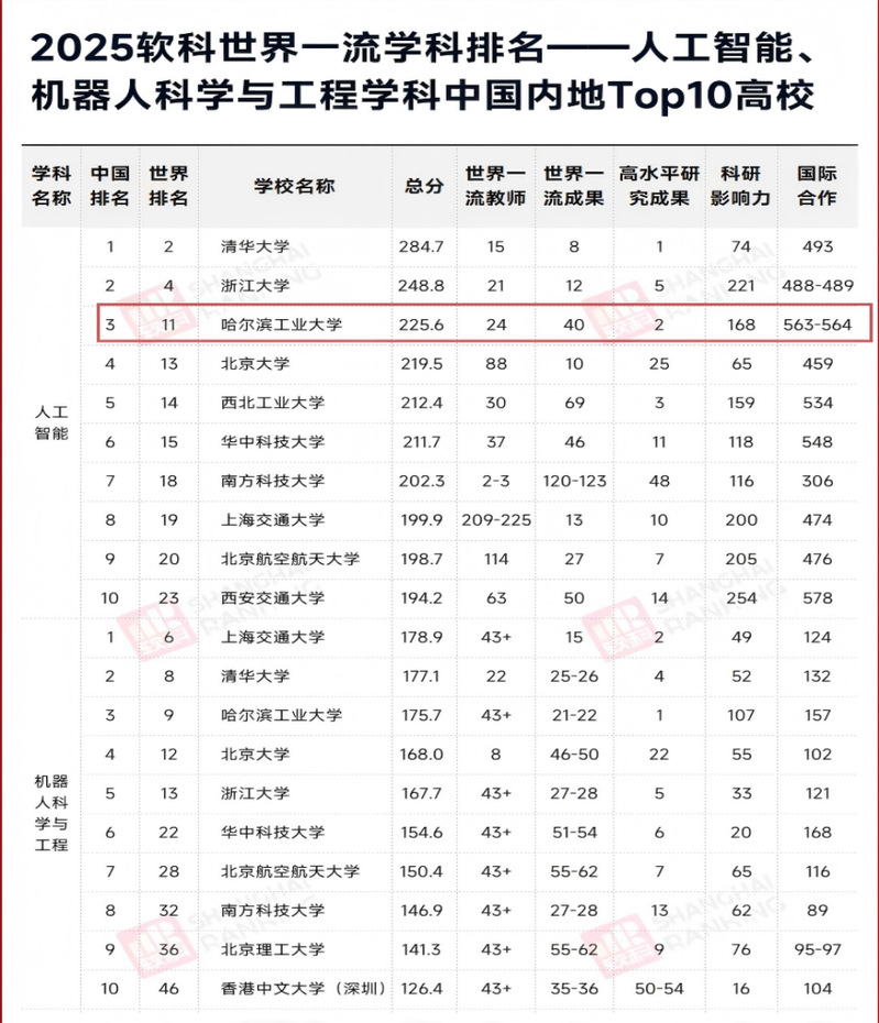 11月18日,高等教育评价专业机构软科正式发布2025“软科世界一流学科排名”。今年排名新增了人工智能、机器人科学与工程两个学科,对全球92个国家和地区的2000余所高校的近2万个学科点进行了评估。在首次发布的人工智能学科排名中,哈尔滨工业大学表现突出,位列中国内地高校第3名,全球排名第11位,在“高水平研究成果”模块中挺进全球前三甲。